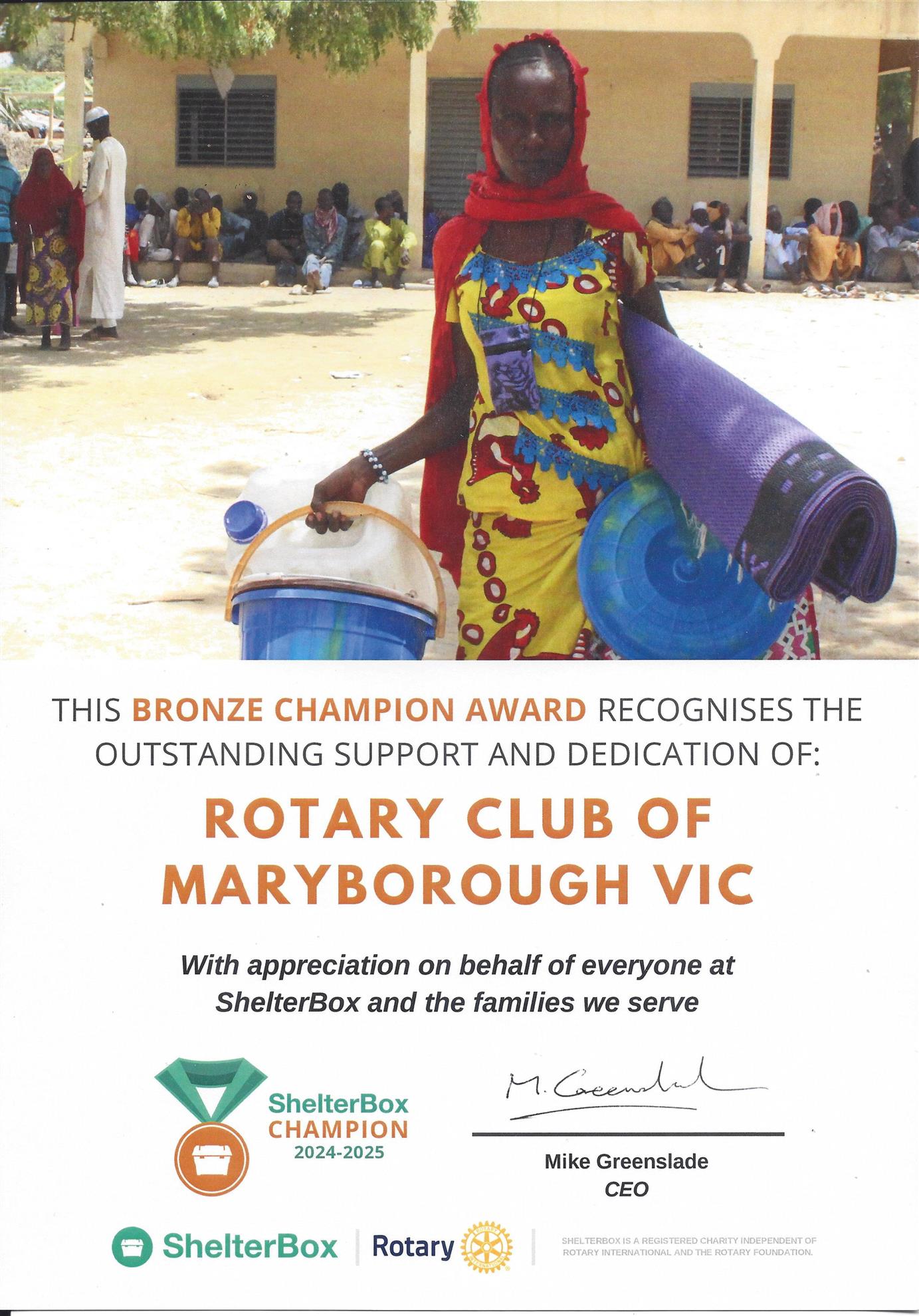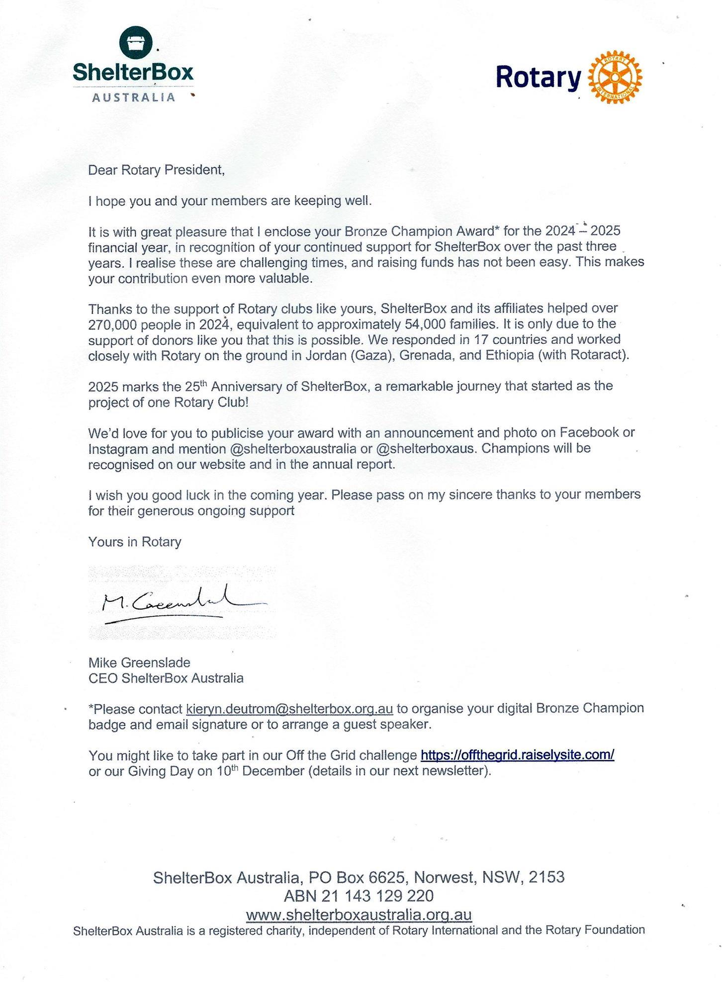 Our club was recently awarded a Bronze Champion Award for the 2024-25 Rotary Year by the “Shelterbox” organization for our ongoing and generous support of the charity. See “Read more…” for the accompanying letter.